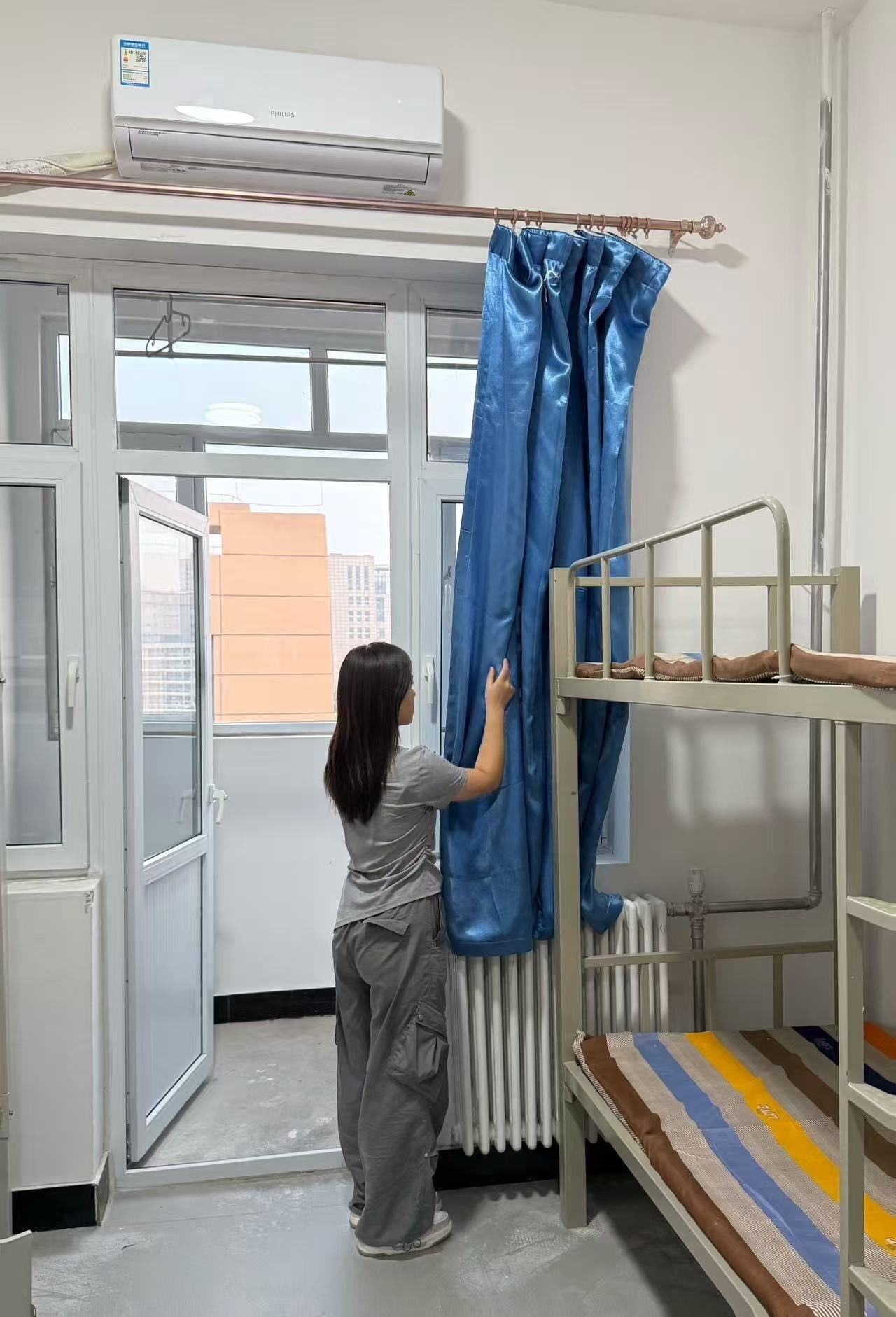 活动现场,王璐副书记率先行动,带领志愿者逐间检查宿舍门窗、灯具、家具等设施,细致排查安全隐患;志愿者们则分工协作,将新生宿舍窗帘全部拆洗干净、晾晒归位,不放过卫生死角。“去年入学时,学长学姐帮我整理宿舍的场景还历历在目,现在能成为志愿者传递这份温暖,特别有意义!”2024级环境设计专业志愿者张可欣一边抚平窗帘褶皱,一边笑着说道。